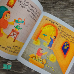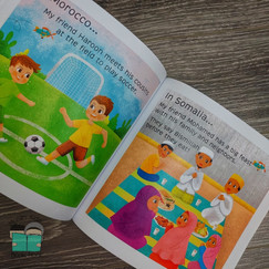 When I saw this book on Amazon, the cover seemed so adorable and the theme promising. There is nothing wrong or problematic about the content this book offers but the book is very basic and surface level. We get to see kids in Palestine, Turkey, Egypt, Lebanon, Sudan, Morocco, Somalia, Tunis, and Pakistan. As you can see by the list of countries included, they only really stick to 2.5 continents. However, the title and the synopsis in the back indicates that this book shows us kids around the world. Also in a book that showcases different countries, the text is kept very generic; kids decorating, baking, playing soccer, exchanging gifts etc. I would have wanted to see some traditions mentioned that might be specific to the countries mentioned. It really is very generic.