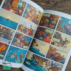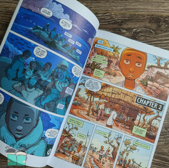 This graphic novel will have the readers clinging on to it rooting for Ebo and Kwame’s safety. The illustrations are so raw and keep the readers hooked. The story is narrated by Ebo in first person. The story is pieced together with flashbacks from the past and the journey of escape in the present. So as the book is read more and more of the puzzles start to form the story. There is a side character name Razak who is on the same journey with the brothers. The story is powerful, breathtaking and filled with hope. Although this story is fictional, there is a short graphic in the end which includes the true story of a refugee who has had a similar experience. If your kids are sensitive to death and violent scenes, I suggest that you read the book first to determine if this is something they can handle. However, this story can spark very fruitful discussions about the reality of refugees and the hardships they experience for safety and hope for a better life and future.