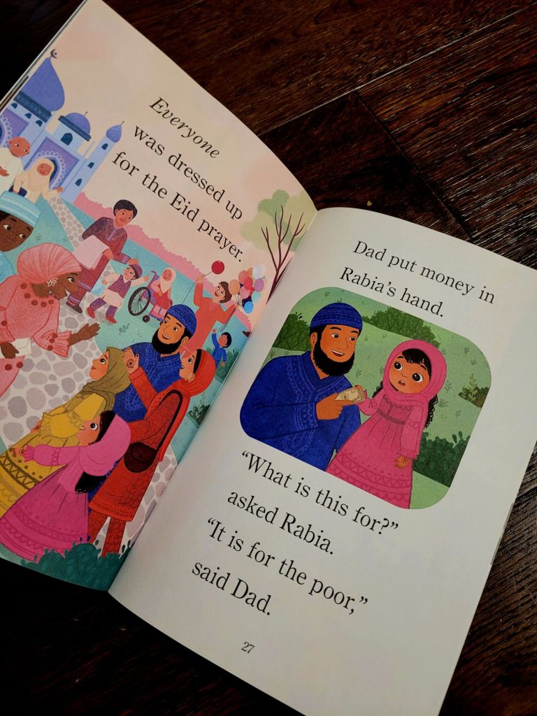As an adult reading this story, it implies that the family gives their zakat ul fitr after Eid prayer. I did hope that would have been made clearer. I am glad zakat ul fitr is included in the story.