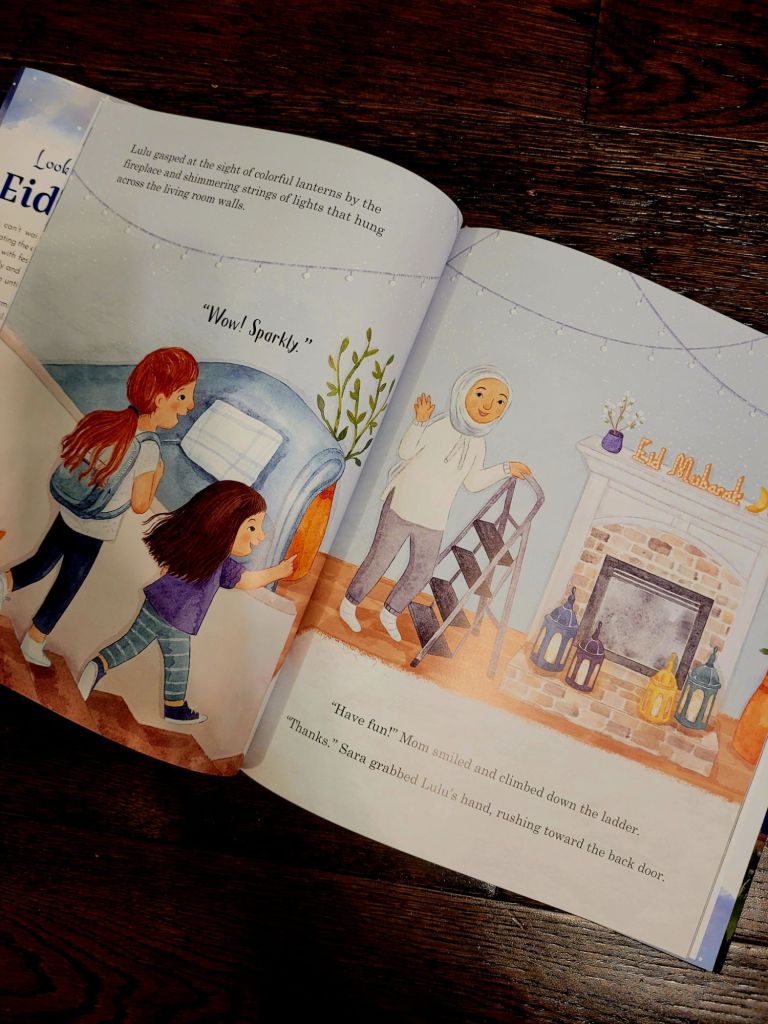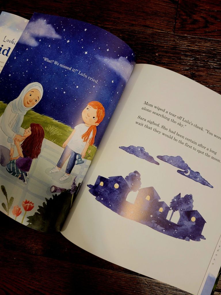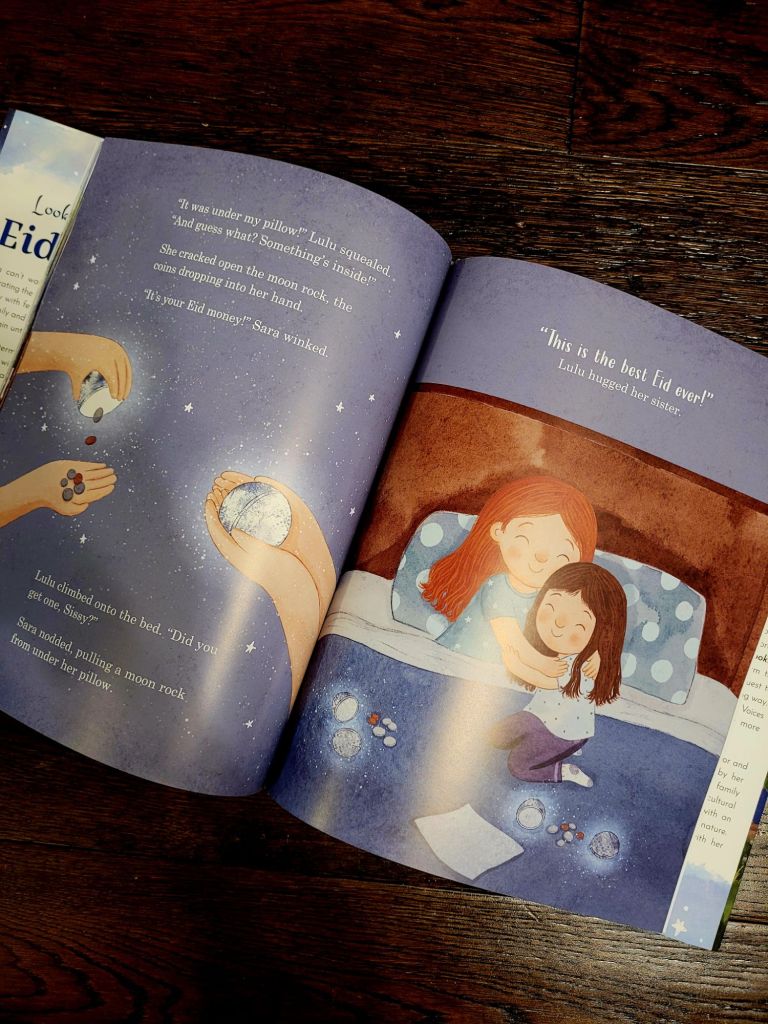 Yet another story showcasing the adventurous search for the crescent moon to mark the day of Eid. The story does not provide much insight about the religious holiday rather it focuses on the bond of the two young sisters. The older sister Lulu, comforts Sara while she is nervour being out in the dark looking for the moon. Their mother calls for them to finally come inside, Sara is disappointed that she hasnt been able to see it. Lulu takes matter into her own hands to cheer up her younger sister.
