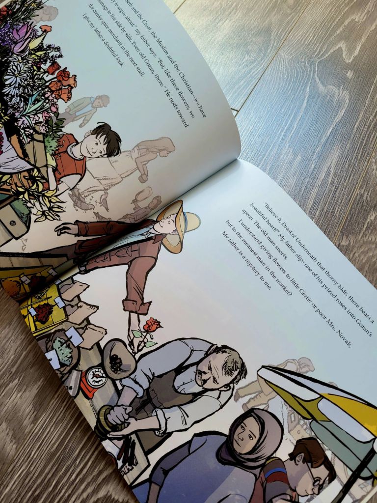 I was torn wether I should write my review of this book or avoid it altogether. However, considering the role of complicity and denial the western world has been playing in the current genocide of Palestinians in Gaza, this book is a prime example of how to discuss war in children’s books without accountability. The book is pushed to be a story of diversity and kindness during times of violence while overlooking the perpetrators and true victims of the Bosnian war in the 90s.