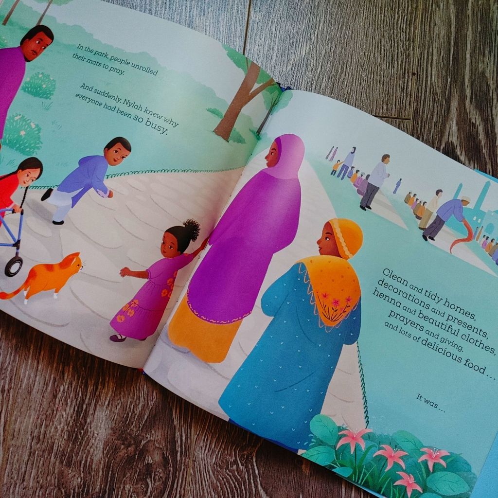This story has an adorable cat as the main character. The cat goes from one house to another and finds the families very busy. The reader is left to wonder why everyone is preoccupied until the very end. The Muslim families are diverse from different backgrounds and skin tones. This is a refreshing perspective compared to all the different books centering the Moon peeking into muslim families windows. Islam is not the centre of the story, and Eid is left to be a surprise until the end so this book can be read among Muslims and non. There is a QR code for the audio reading which we listened to while flipping the pages. Overall this is an adorable read.