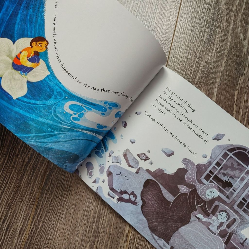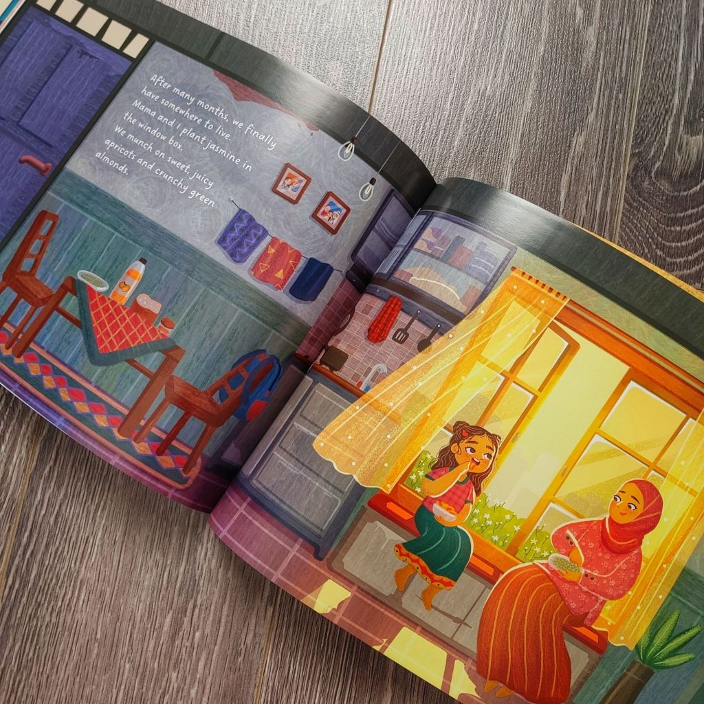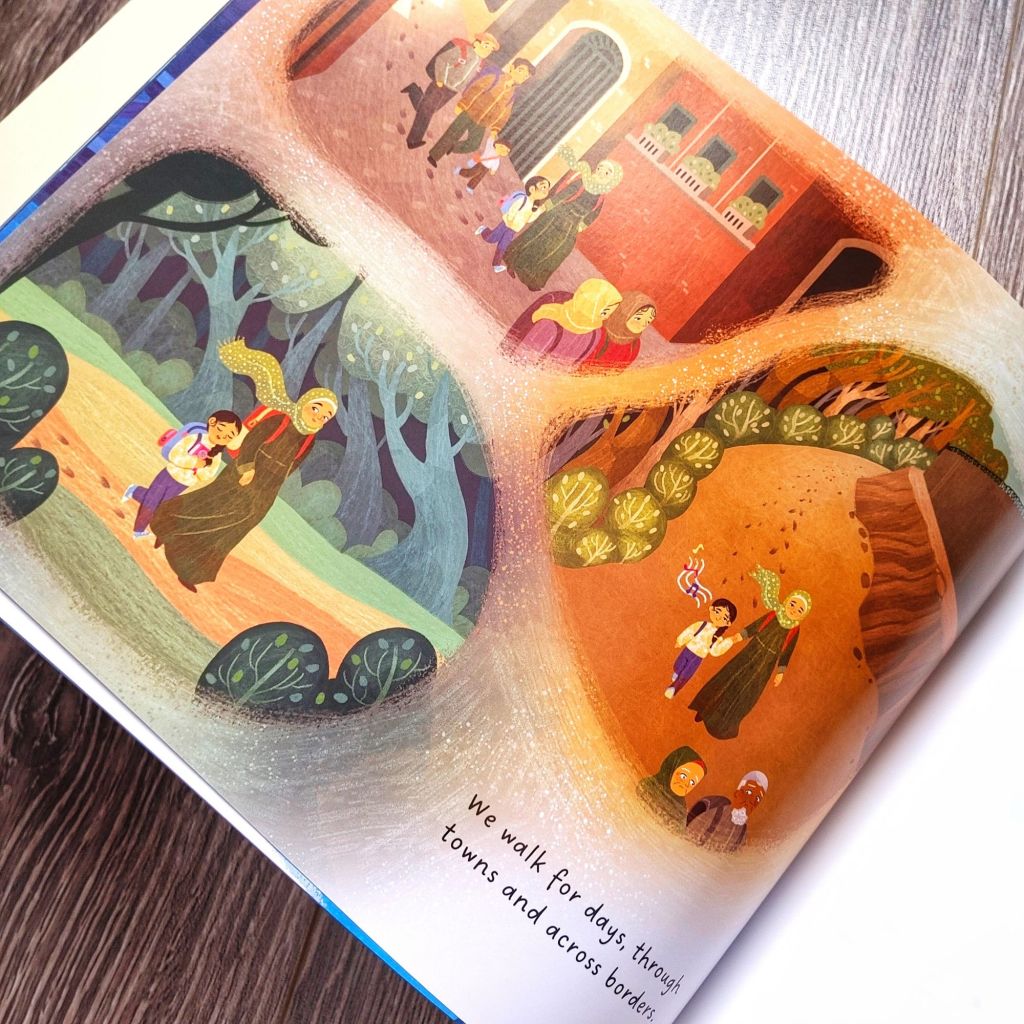 This picture book is written in lyrical creative language. The words are heartfelt and beautiful. The illustrations accompany the words on each page wonderfully. This is a story of a Muslim family taking refuge. There isn’t any specification about where Amina and her bother are fleeing from or where they find safety. I love that there are Islamic references in this refugee story.