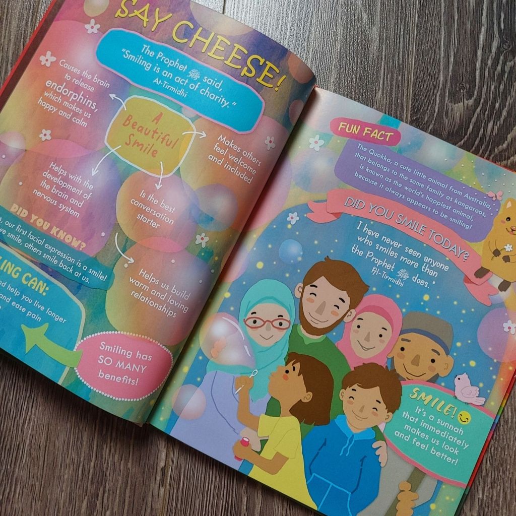 Some items included are: rain, smiling, horseback riding and archery, teeth brushing, skin, brain health and more. Each subject has a two-page spread dedicated which includes the hadith reference, fun facts, duas and more.