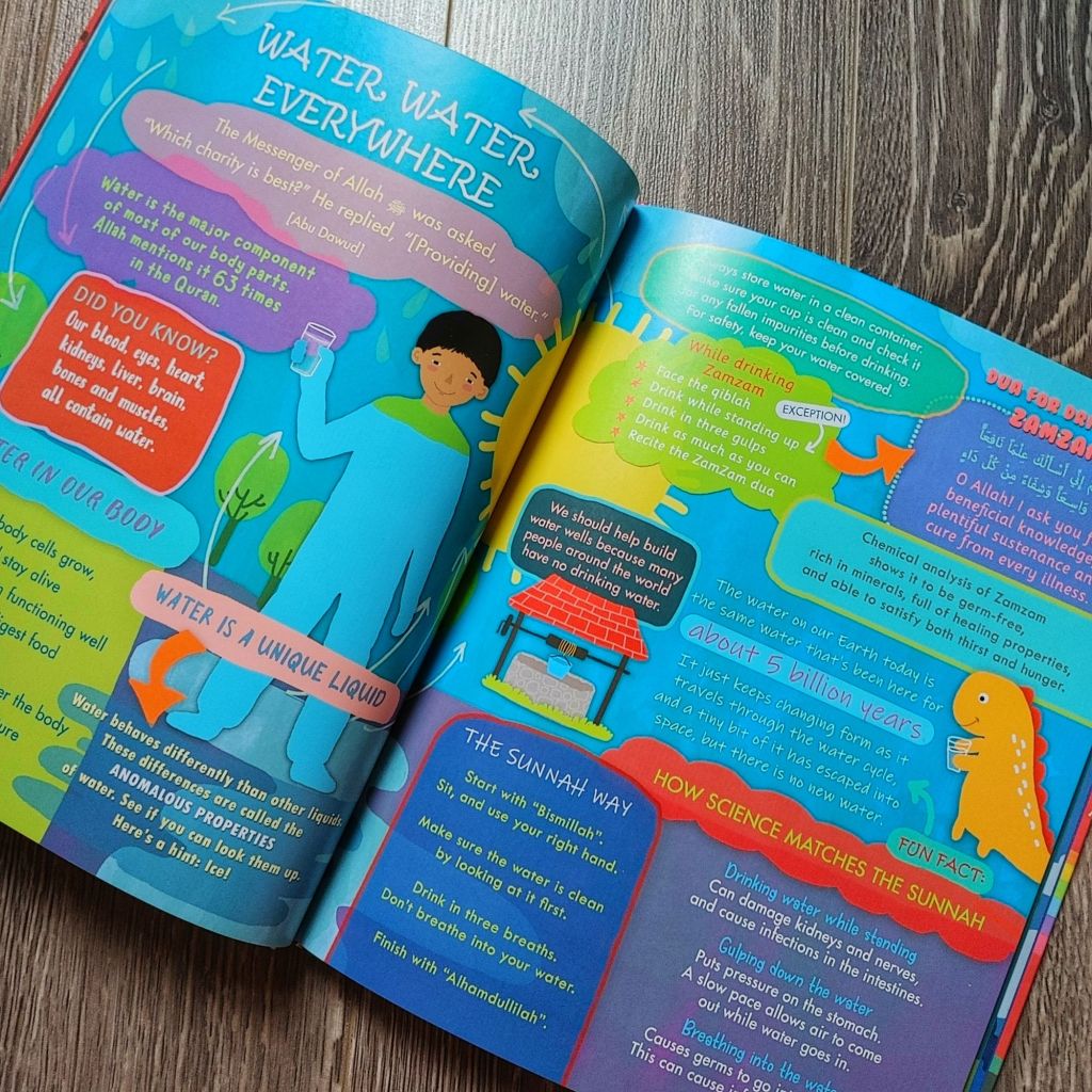 The text is short, concise and catchy. The illustrations are vibrant and fun. My kids have grabbed this book off my hands very quickly after it came and loved reading through fun facts. Although I love that hadith and Qur’anic references are sourced, I wish that there was a bibliography of the scientific research was included. This is a common requirement for all non-fiction books.