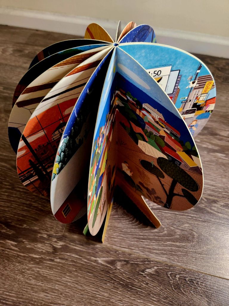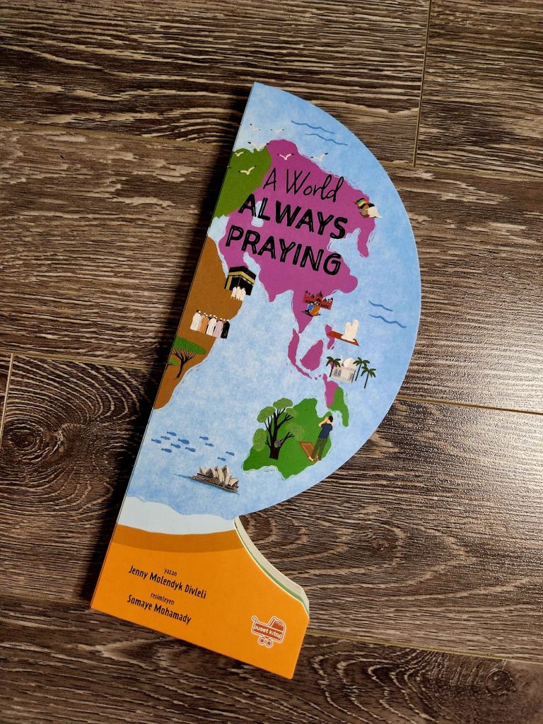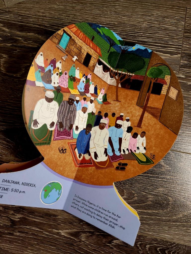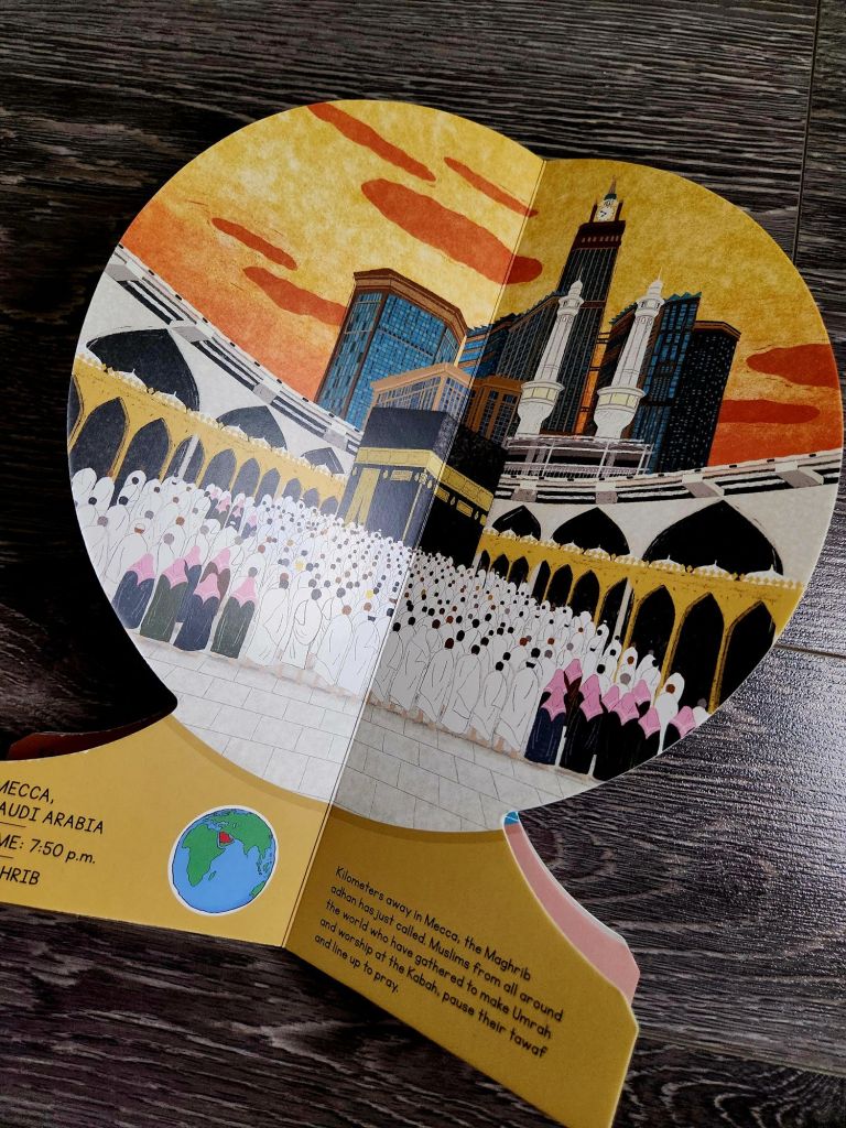 This adorable board book is unique. It focuses on the diverse Muslim ummah around the world and the different times of day the prayers fall. This board book is shaped like a globe with magnets on the first and last page to display it open. Each page includes a specific prayer time, in a specific part of the world. The book has been inspired by the Ayah in the Qur’an 2:115. This book would make a great conversation starter about time zones, prayer times and it would be a great addition to a classroom or a library.