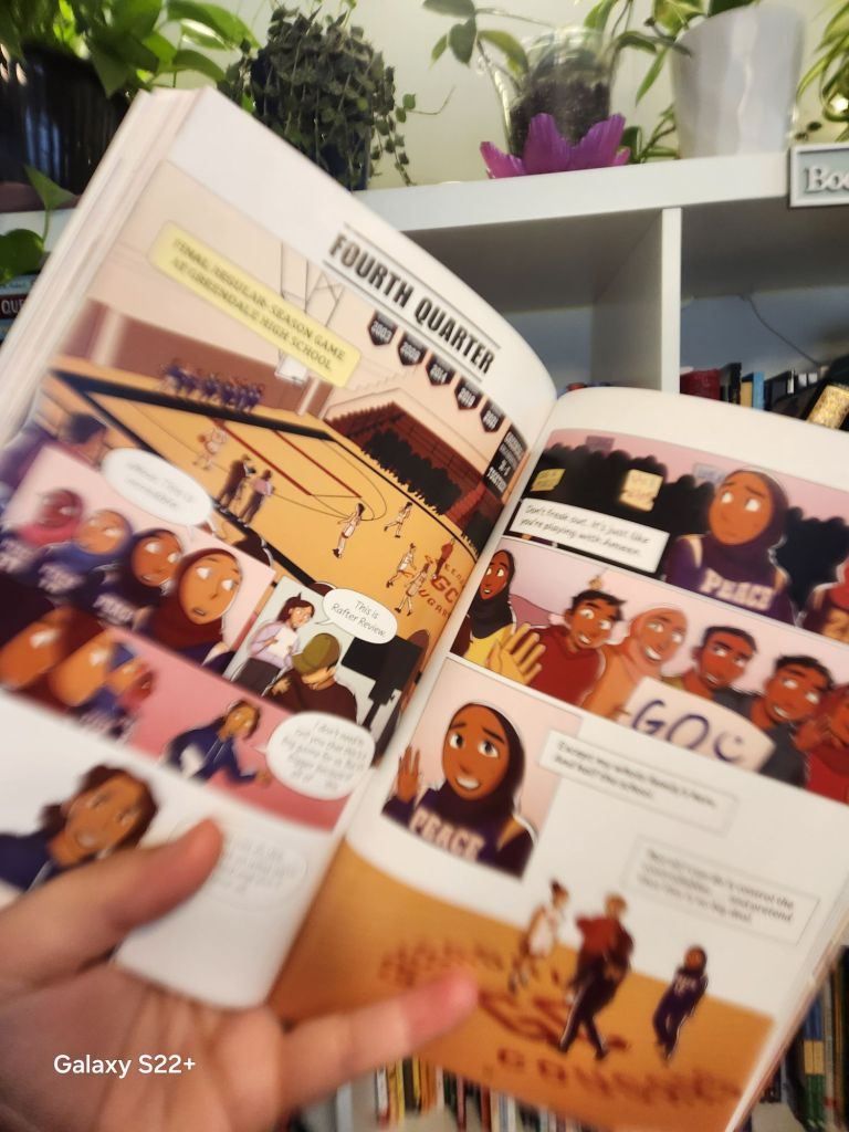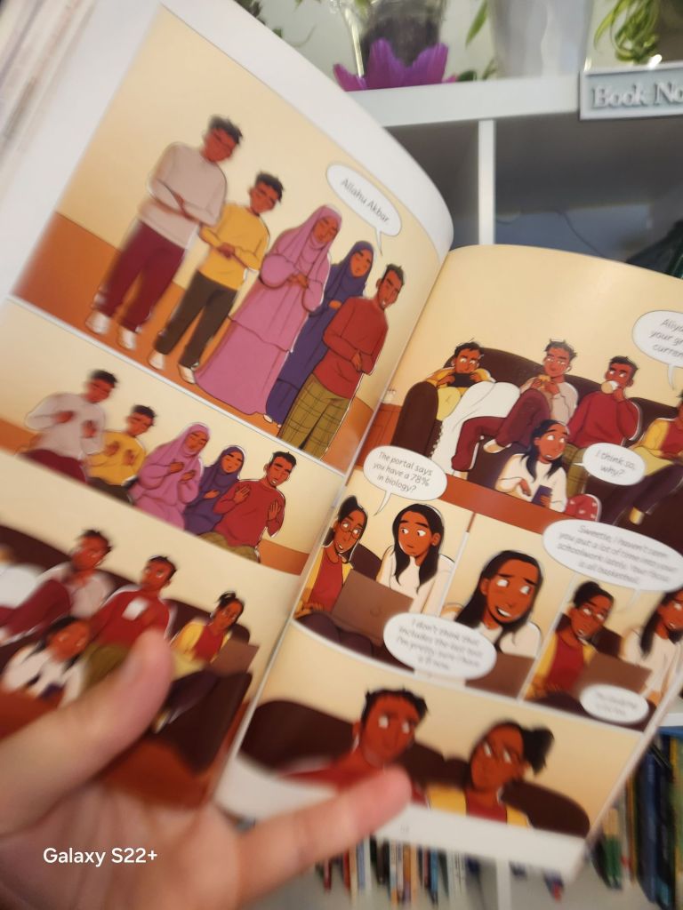With the limited Muslim graphic novel options for middlegraders, I managed to get my hands on a copy of this book. This story is based on a true story of Salam School girls basketball team under a new coach. The all-hijabi team got national coverage about being Muslim and playing basketball. The story is fast paced and easy to read. I love the fact that this book about an Islamic school basketball team is published traditionally and is available in library bookshelves throughout North America. However, I wish due diligence was done in one of the few scenes where Islam is present, the family of praying together is shown amiss. The dad is leading the prayer, mom, daughter and 2 sons are illustrated praying behind dad all together in the same line (see pic). Other than this, the book is clean and has a great message to offer the readers.