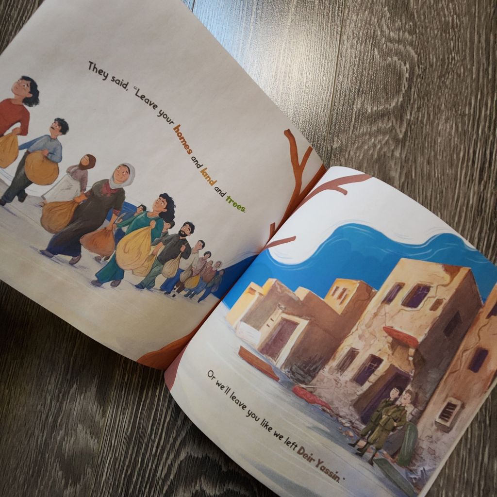 The words are gentle and easy to follow, but does not shy away from mentioning the occupying forces and their military operations that pushed Palestinians out of their homes.