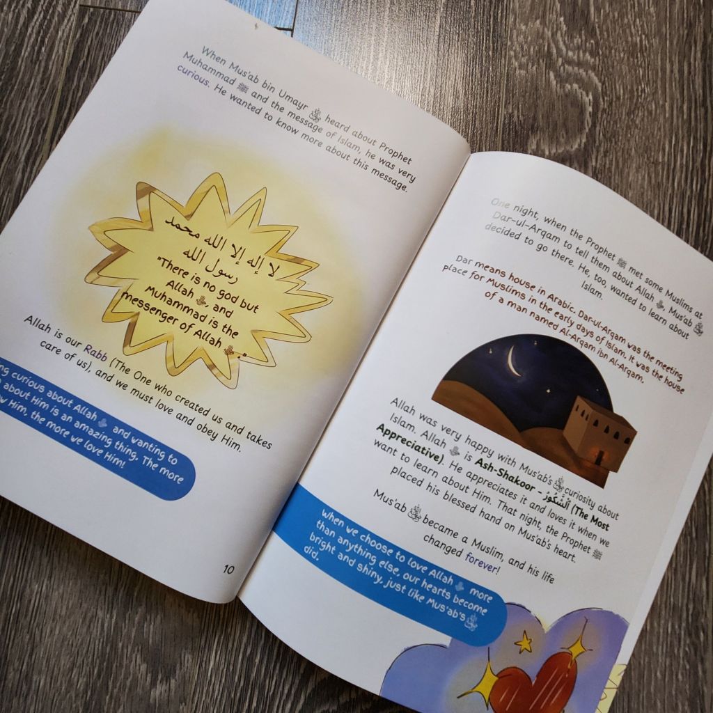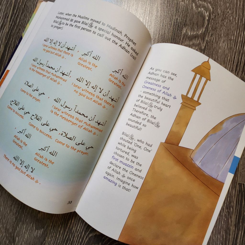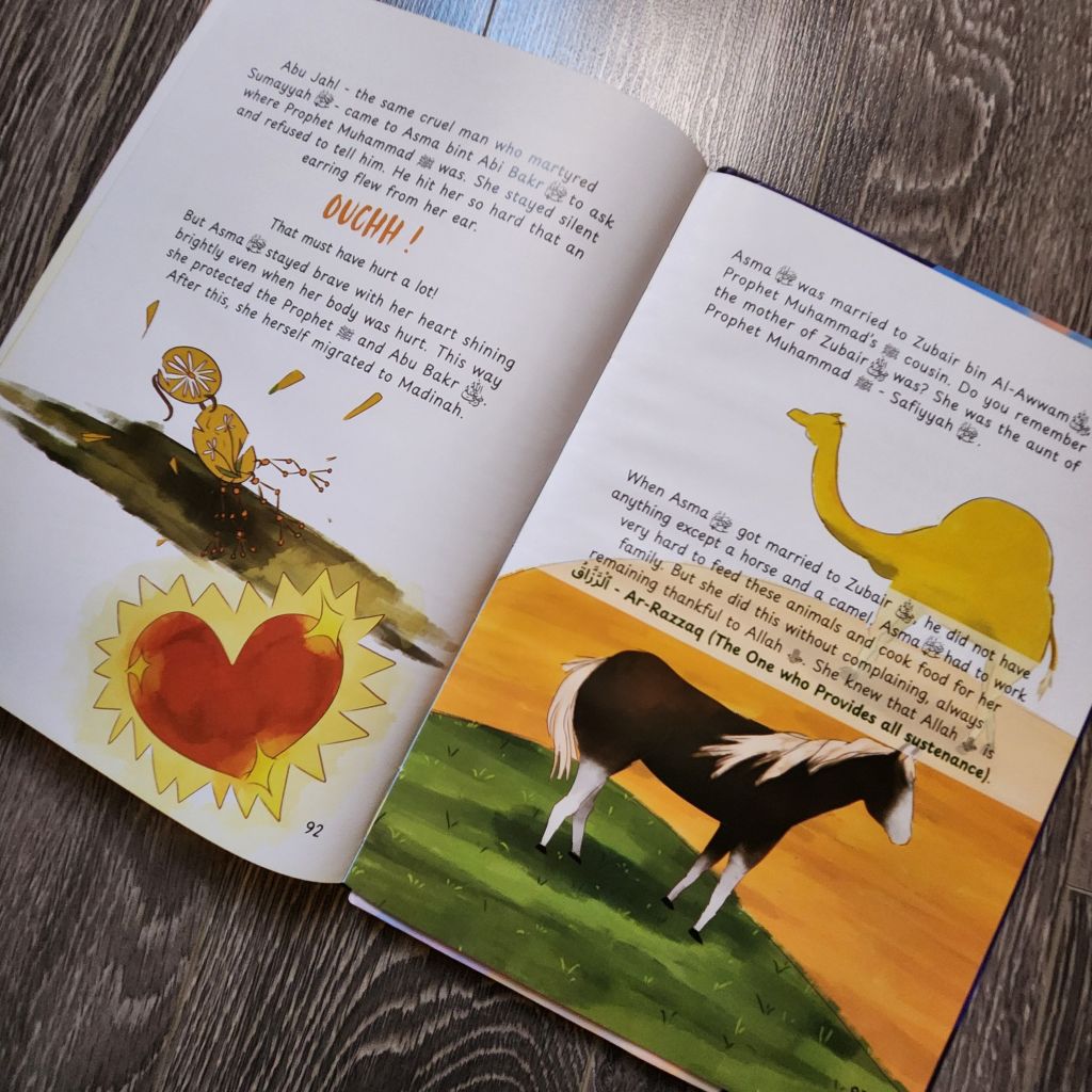 The text is light and interactive. It doesn’t get lengthy and monotonous like many Islamic biographies do. Even though the illustrations are quite bland, my kids and I did not mind it because the appealing approach and the text itself carries the stories. The thought provoking questions keep the little minds focused in the story and encourages them to make their own connection from their daily life to the theme that is being discussed. The physical quality of the book is not quite there so it’s shelf life might be in question.