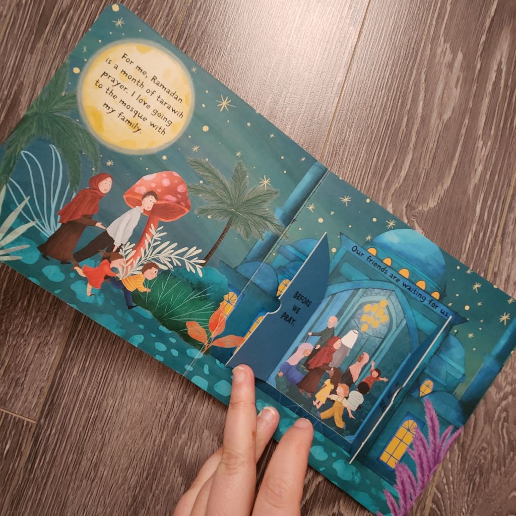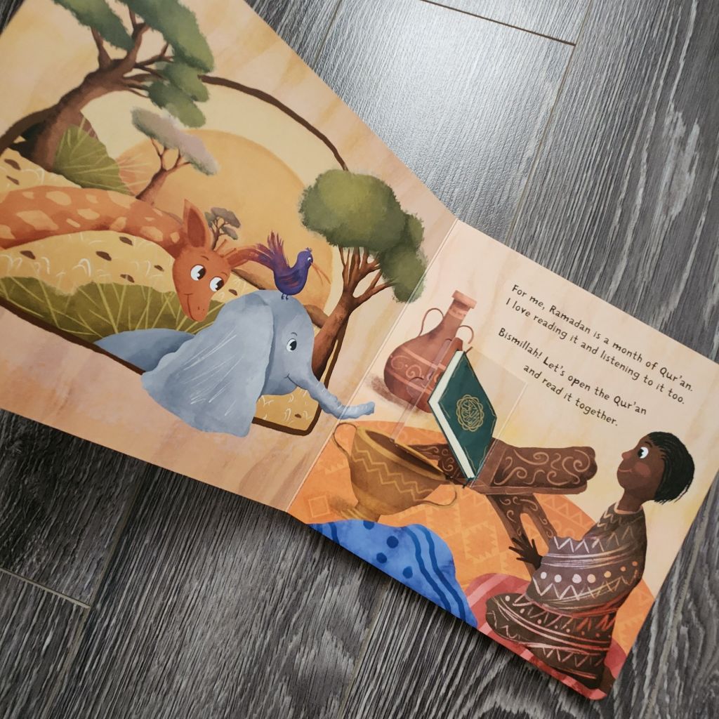 This lift-a-flap board book is simple and easy to read. A different character, I assume a child tells us what they love about Ramadan. One says they love suhoor, one says they love to read Qur’an, another says attending taraweeh, etc. Each page is set somewhere different in the world with diverse characters. They touch up on key points Qur’an, iftar, suhoor, prayer, charity and ends with Eid. However, fasting isn’t mentioned at all, so I am not sure if that was intentional.